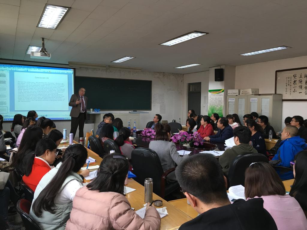 五层会议室座无虚席,加拿大阿尔伯塔大学Massimo Verdicchio教授应邀做了一场题为“美国文学中的隐喻——以爱伦·坡、霍桑及麦尔维尔为中心的考察”的报告。