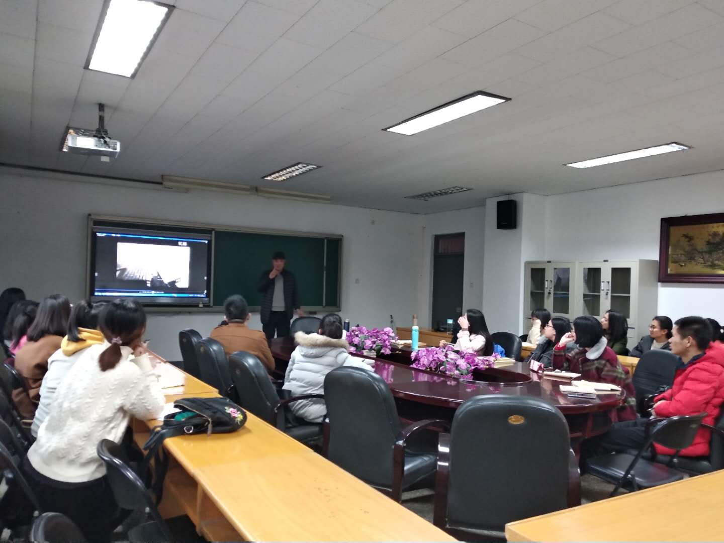 硕士导师王苏生在12号楼5层会议室作“电影是什么”的学术讲座,文艺学专业的硕士研究生听取报告并进行了交流。