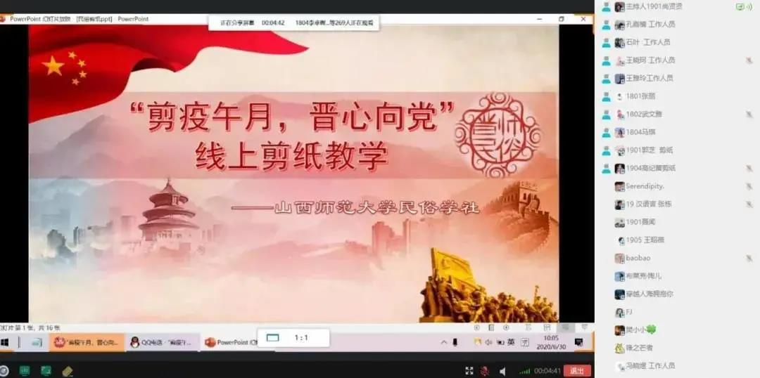同时,为庆祝中国共产党成立99周年,我党支部于6月30日与民俗学社联合举办了以“剪疫午月,晋心向党”为主题的线上剪纸教学活动,通过剪纸这项中华民族传统技艺致敬闪烁的红星与最可爱的人。三百余名大学生齐聚云端,剪纸传情,共庆建党99周年,在提升同学们动手能力的同时培育了当代大学生的爱党爱国情怀。
