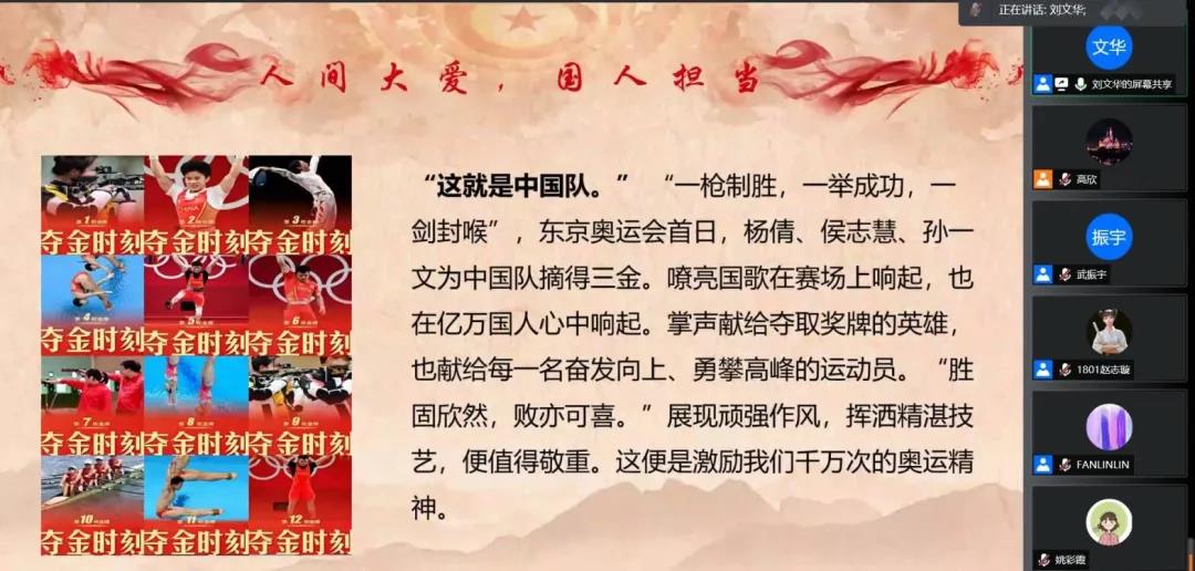 刘文华同志以《人间大爱,国人担当》为主题,从“多方力量汇聚,风雨共肩担当”和“健儿东京拼搏,铸就中国奇迹”两大主题出发进行了分享。她谈到了在暴雨中志愿者的无私奉献、国企的责任担当、汛情下挺身而出的共产党员和奥运场上自信拼搏的运动员们。“有人在汛情一线争分夺秒,有人在抗疫前线日夜坚守,有人在奥运赛场英勇拼搏,每个担当奉献、恪尽职守的中国人都了不起!”刘文华的讲解让参会同志深受感动。李元杰同志说:“同样作为零零后、作为新时代青年大学生,我们应该从小事做起,把平凡的事做得不平凡,把简单的事做到不简单。”赵文文同志讲道:“洪涝发生后,我们国家便及时展开了防汛抗灾工作,在党中央的统一领导下,我们的军人战士、党员群众都纷纷加入抗灾行列,展现了我们祖国万众一心的强大合力。”刘晓琴同志分享道:“在这场抗洪抢险斗争中又一次展现出来‘万众一心、众志成城,不怕困难、顽强拼搏,坚韧不拔、敢于胜利’的伟大抗洪精神,是中国人民弥足珍贵的精神财富。”