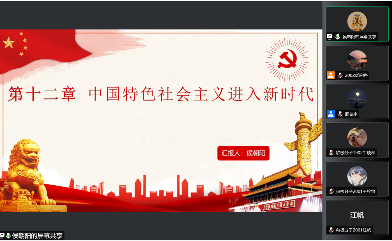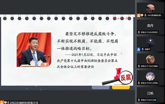 “学雷锋,送温暖”小组学生党支部在腾讯会议开展学习党风廉政建设与《中国共产党组织建设一百年》第十二章主题党日活动。会议由支部副书记武振宇主持,支部全体党员和积极分子参加。学生党员侯朝阳同志担任主讲人。