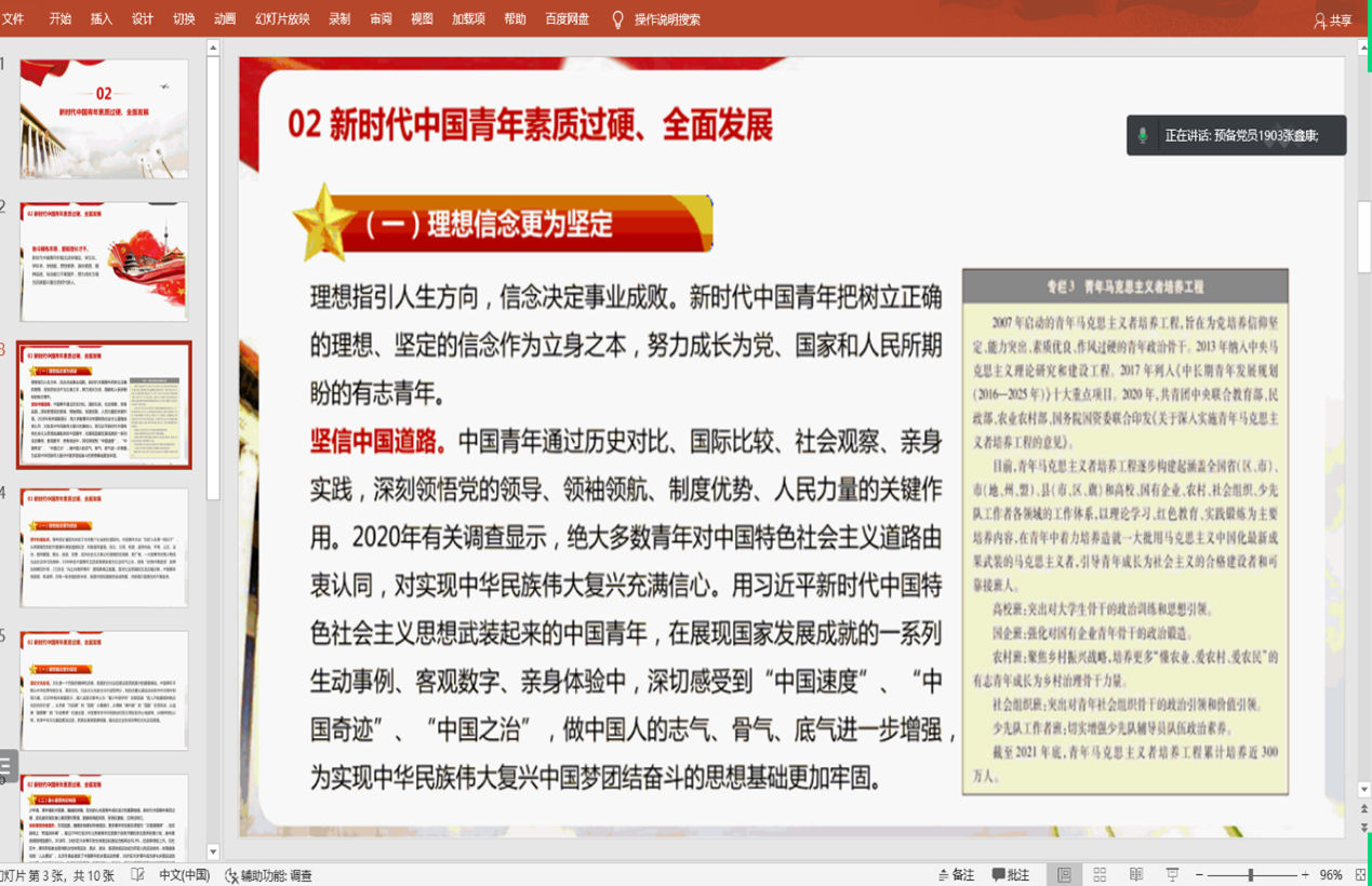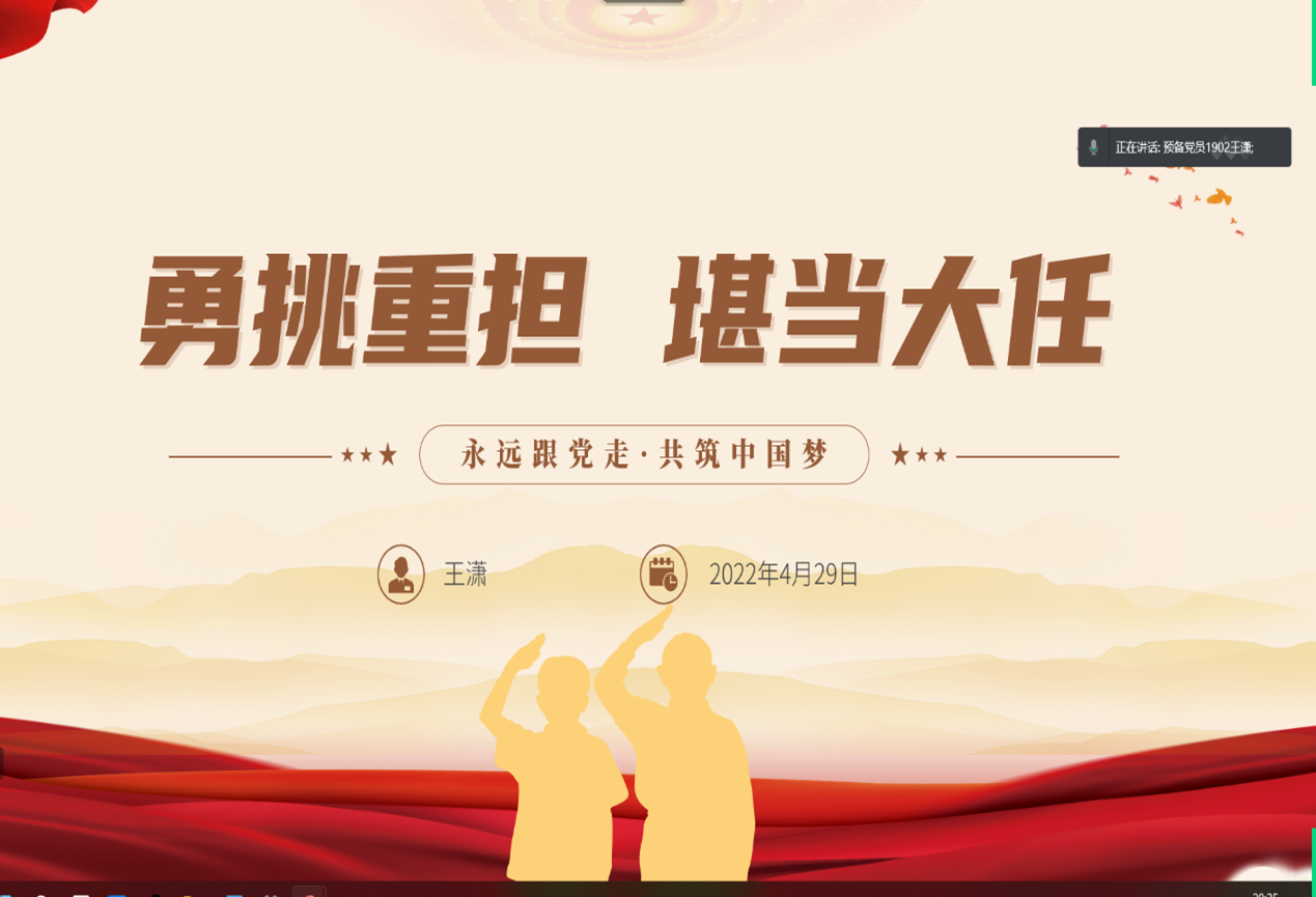 支部党员王佳佳、张鑫康、王潇、柳昊四位同志带领全体与会人员进行学习,他们分别介绍了新时代中国青年“生逢盛世,共享机遇”、“素质过硬,全面发展”、“勇挑重担,堪当大任”以及“胸怀世界,展现担当”四部分内容,指出作为青年党员干部,我们要自觉将人生追求同国家发展进步紧密结合起来,传承发扬好“坚持开拓创新”这一党的百年奋斗宝贵历史经验,树立主动开拓创新的思维,涵养敢于开拓创新的勇气,增强善于开拓创新的能力,不畏艰险、迎难而上,发扬“大胆试、大胆闯”的拓荒精神,增强“勇向潮头立,敢为天下先”的创新意识。