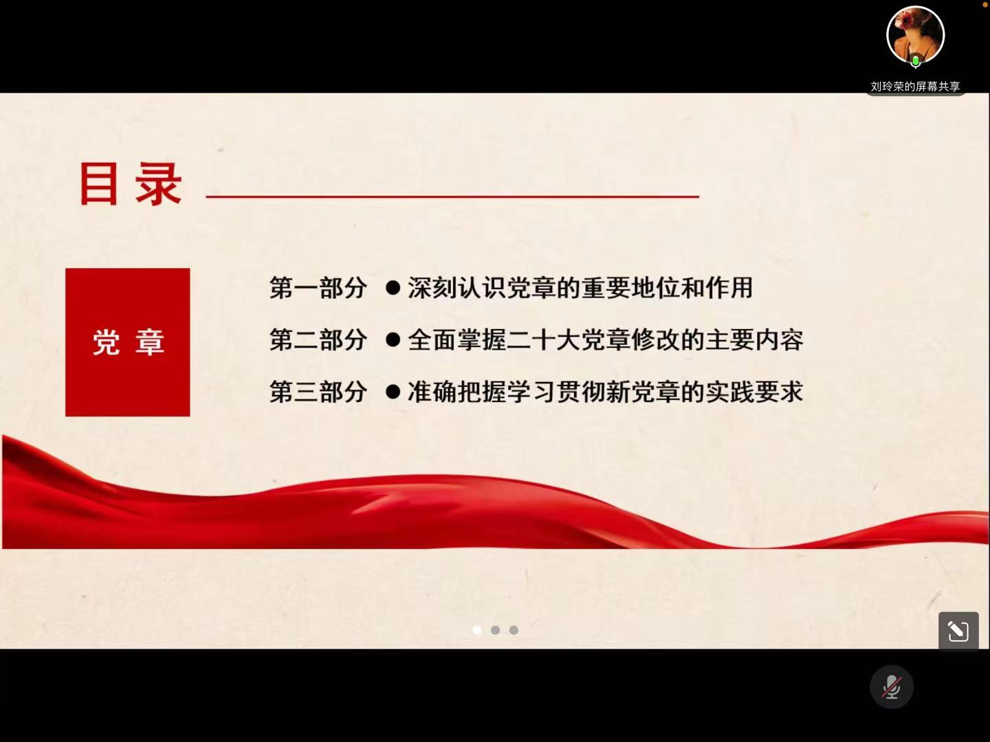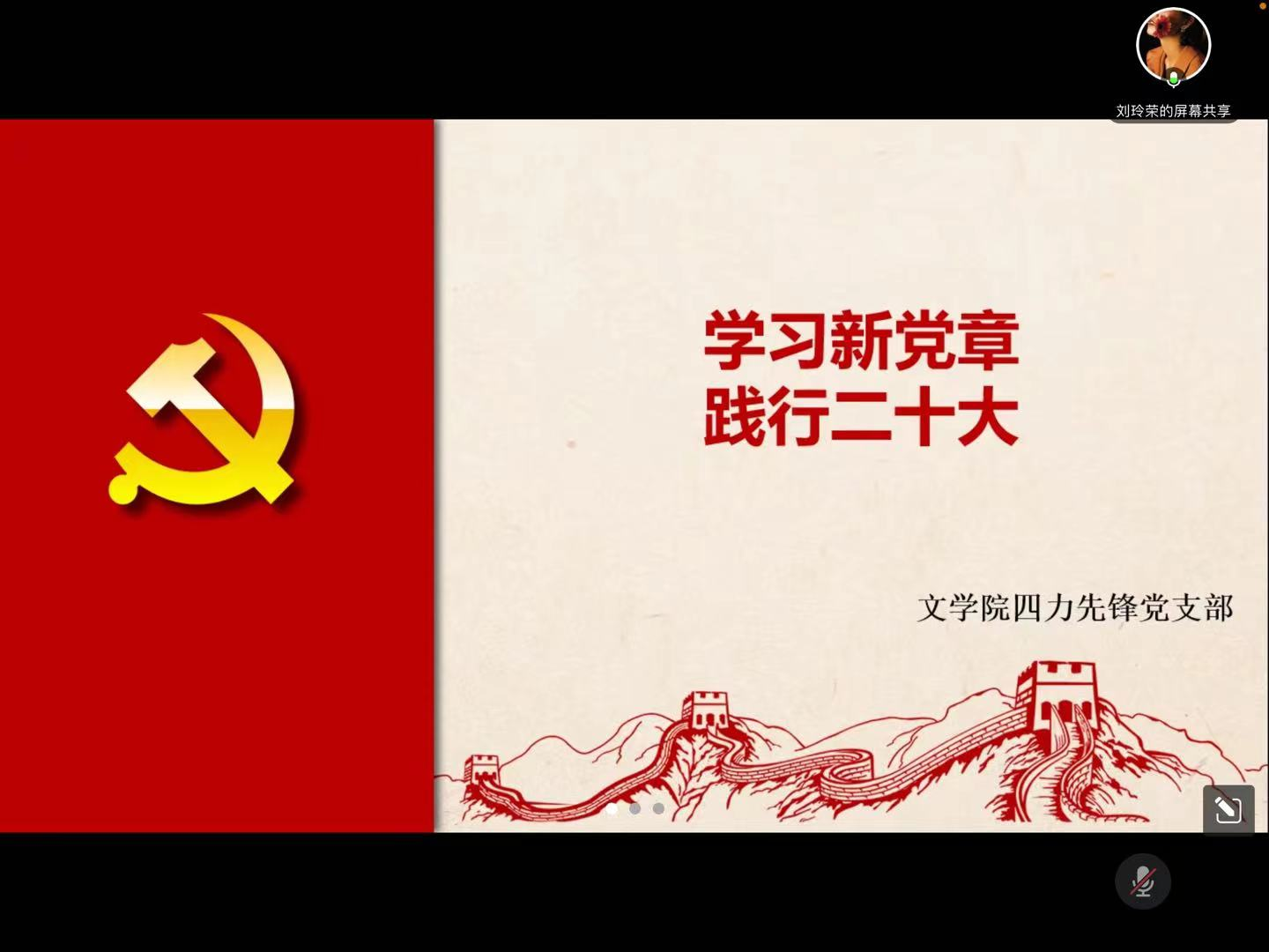 “四力先锋”学生党支部于线上开展“学习新党章 践行二十大”主题党日活动。会议由支部书记杨颖主持,支部党员刘玲荣主讲,全体党员参加。