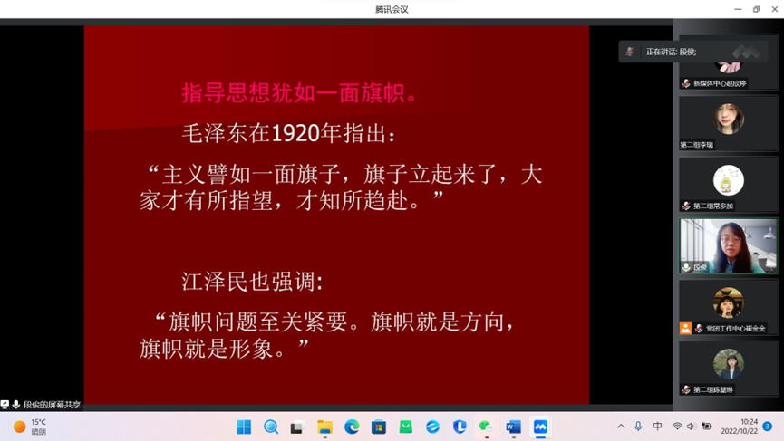 副院长段俊,以“指导思想犹如一面旗帜”开题,为大家讲解了中国共产党的指导思想。她指出,将党的指导思想与中国具体实践相结合是推进我国发展事业行稳致远的重要前提。