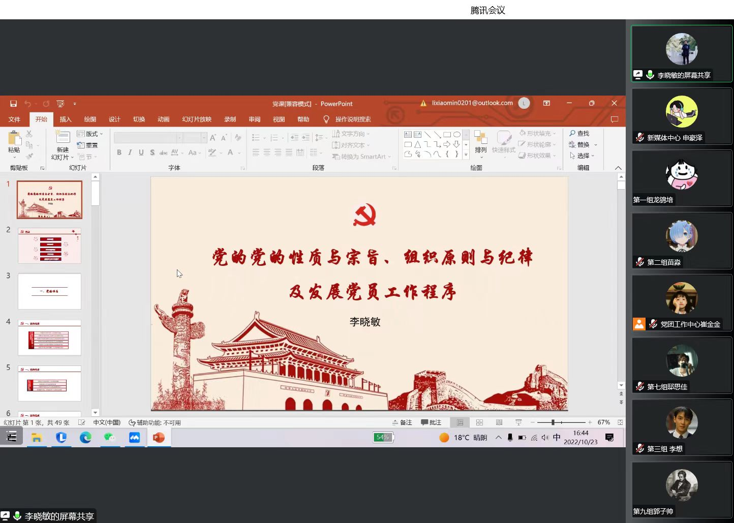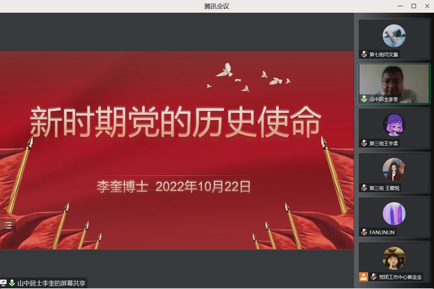 文学及写作学研究生党支部书记李奎以“新时代党的历史使命”为主题,结合党的二十大报告,讲述了党和国家的巨大变化,诠释了新时代党的历史使命以及从新时期到新时代党的发展的重大意义。