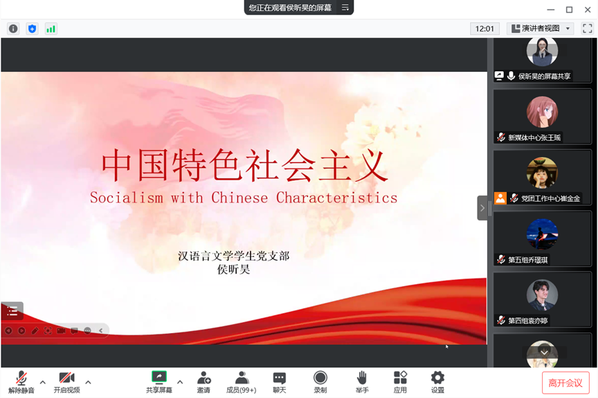 汉语言文学学生党支部书记侯昕昊从伟大历史转折和中国特色社会主义的开创、把中国特色社会主义推向21世纪、在新形势下坚持和发展中国特色社会主义、中国特色社会主义进入新时代四个方面对中国特色社会主义的专题进行讲解。