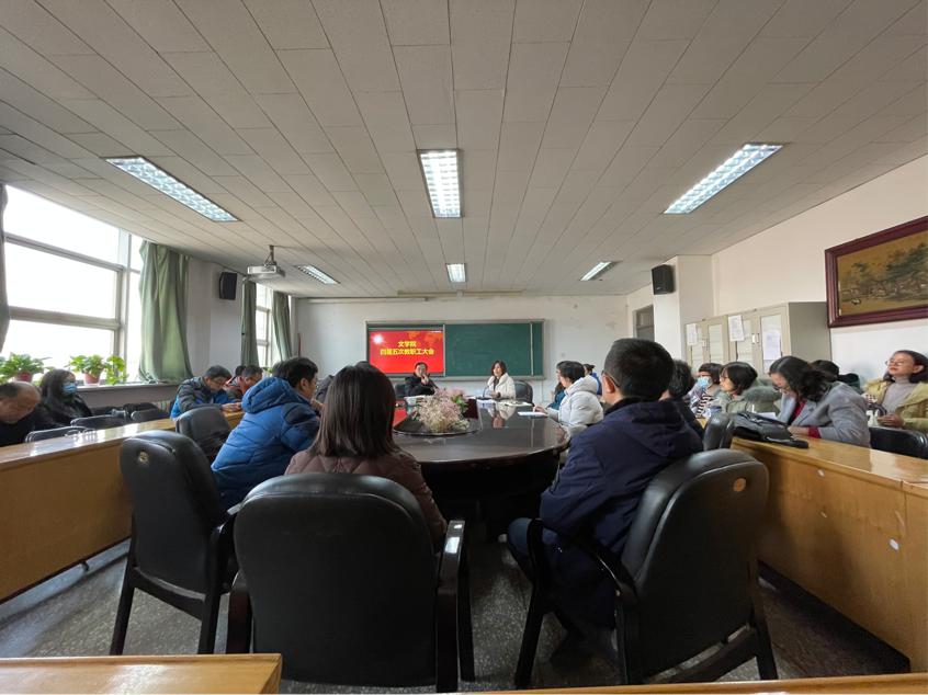 会议室召开了四届五次教职工大会,全体教职工参加,党委书记强汾生主持会议。