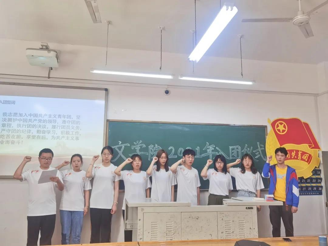 仪式伊始,全体同学起立合唱国歌。1905班团支书米玉晓宣读新团员名单,并为其颁发团员证,佩戴团徽。团员代表刘佳宣读《中国共产主义青年团章程》中有关团员义务和权利的条例后,全体成员面向团旗,高举右拳庄严宣誓。