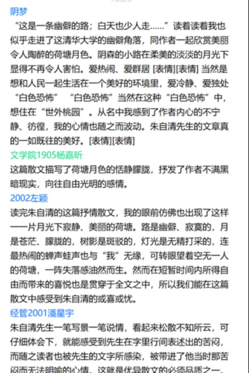 潘星宇说道:“朱自清先生一笔写景一笔说情,仔细体会下,就能感受到先生苦闷无法明喻的心情,他的散文真切感人。”