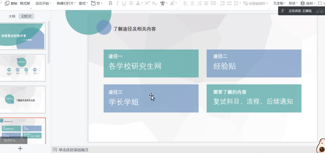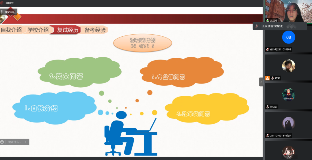 学习部通过腾讯会议举办了考研复试经验分享会。本次分享会诚邀17级考研成绩优异的四位学姐李珂鑫、吴和晋、武慧瑾、王璐瑶担任主讲人。