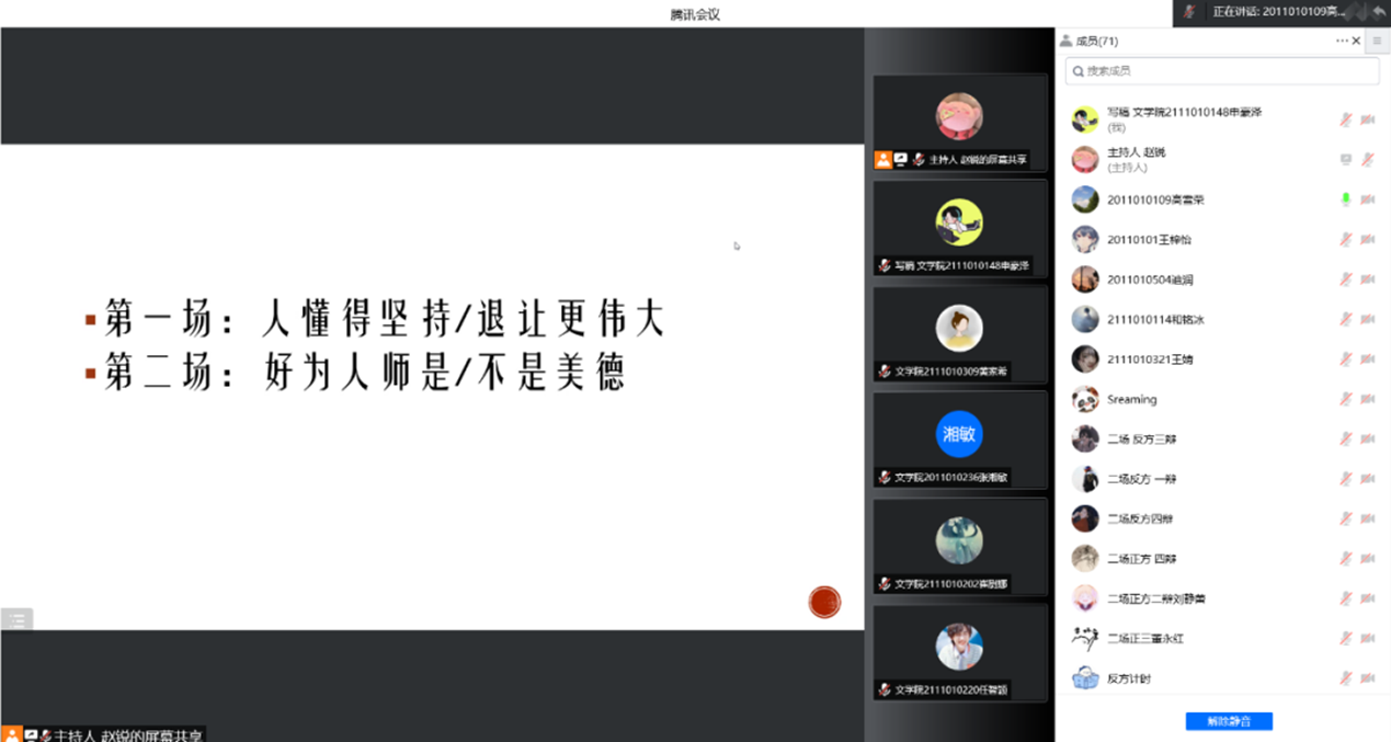 本次辩论赛共设置两场,围绕“人懂得坚持还是退让哪个更伟大”和 “好为人师是不是美德”两个话题分别展开。从开篇立论到一对一攻辩,从自由辩到结辩陈词,正反方的表现都可圈可点。在“人懂得坚持还是退让哪个更伟大” 这场辩论中,辩手们联系“考研失利应该如何应对”的问题展开辩论,措辞犀利,思路清晰。针对“好为人师是不是美德”这一辩题,双方辩手对定义发起了争夺战,也借“为人师”与“好为人师”,对其中所蕴含的态度问题进行了有效探讨。最后,三位评委对本次辩论赛做出点评,分别指出了双方的优点和不足,并表示期待大家的进步。