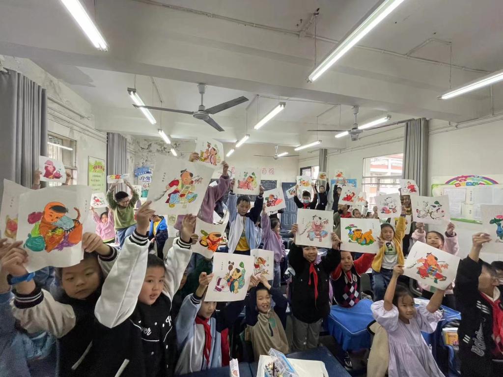 在与孩子们合照后,高老师动情地说:“孩子们灿烂的笑容深深印刻在了我的脑海,整堂课的气氛欢快,他们的年画作品,都各具特色,充满了童趣,令我深受感染。”