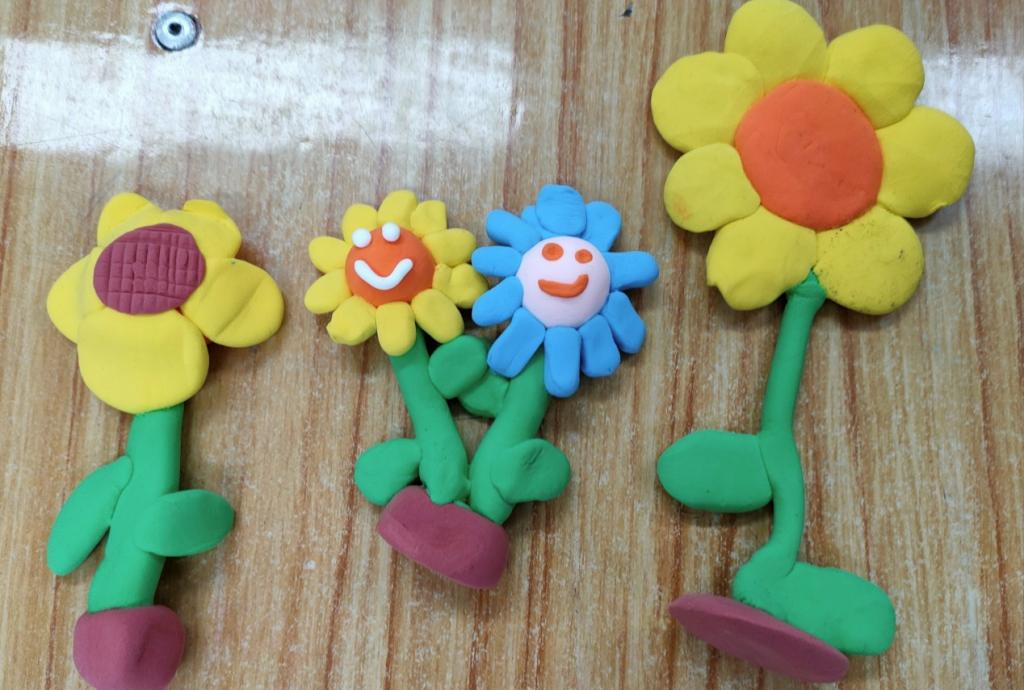 手工课的主要材料是“超轻黏土”。动手操作前,郭老师由“认识材料”入手,为孩子们总结了黏土的特性与用途。在制作教学中,郭老师的讲解生动活泼,耐心细致,一步一步引导孩子们用黏土制作简单的形状——球形、正方体、圆柱……“先制作花盘、花瓣,然后是底座、花茎和花叶,最后将它们一一组装起来”几块黏土在郭老师的手里轻轻揉搓,瞬间“开”出了一朵美丽的向日葵。孩子们兴奋不已,也纷纷动起手来,不一会儿,形态各异的向日葵便也朵朵绽放在他们的指尖,独一无二,又可爱十足,传递着童心的纯净和美好。