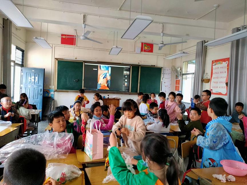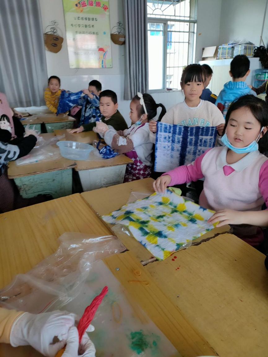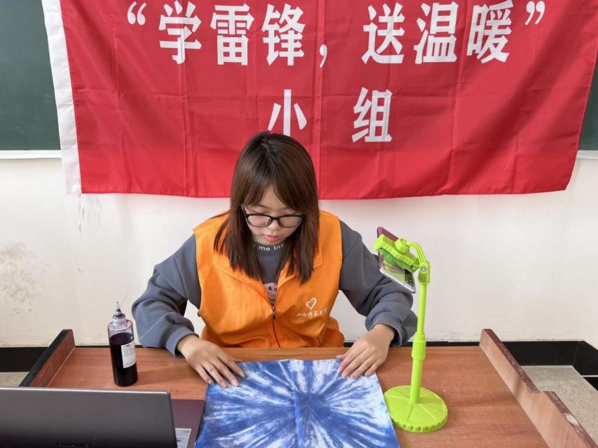学生会“学雷锋,送温暖”小组志愿者闫晓旭连线四川德阳市中江县小南街学校,为三年级的孩子们讲授了一堂生动有趣的扎染艺术课。