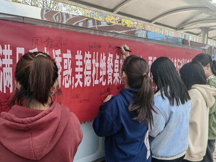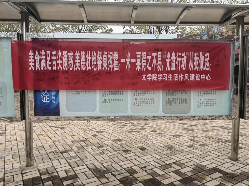 学生会生活权益部在六号教学楼前开展光盘打卡横幅签名活动,并于11月1日至14日举行线上“我们都是追‘光’者”微博光盘行动打卡活动。