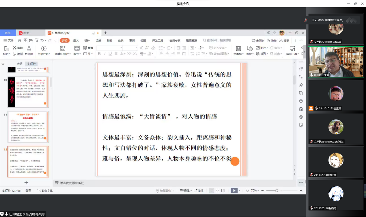 会议伊始,李奎首先简要介绍了《红楼梦》的作者、创作背景、人物简介以及故事主要情节。接着便进入主题,通过列举不同人物在文中的言行举止来分析人物形象的多样性,从《红楼梦》的经典性、《红楼梦》中的两个世界、《红楼梦》中的传统文化三个层面进行讲解,使得讲述过程变得更加的生动有趣。鲁迅先生曾道,“一部红楼梦,修学家看见《易》,道学家看见淫,才子看见缠绵,革命家看见排满,流言家看见宫闱秘事。”不同的读者看待《红楼梦》这本书的角度不同,因此会产生不同的思考。李奎老师对《红楼梦》一书进行多方面的解读,从而使我们更好的欣赏了这部兼具人性美和悲剧美的史诗,更好地感受了书中所演绎的人生百态。