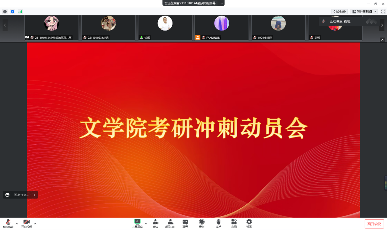 考研冲刺动员会。本次会议由院团委书记樊琳琳主持,院党委书记钱成、副院长段俊出席,19级考研同学参加。会议由1903班李晓婷,就读于兰州大学的2020届毕业生赵连国,就读于内蒙古师范大学的2021届毕业生高馨三位学生代表主讲。