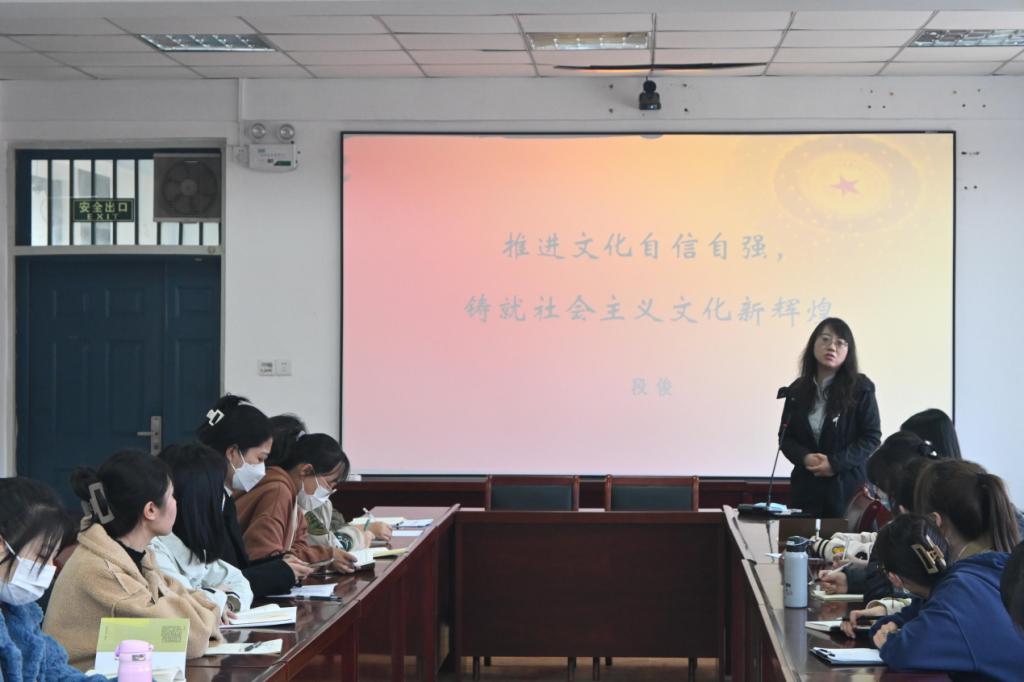 段俊以“推进文化自信自强”为主题,紧扣党的二十大内容与精神,解读了党的二十大对文化、文艺等方面的指示与要求。“文运同国运相牵,文脉同国脉相连”,她强调,要在教育过程中挖掘优秀传统文化基因,将文艺与大众结合,坚定文化自信;院学生会举办相关活动也要坚持以传承优秀传统文化为理念,创造性转化、创新性发展,举办更多富有文化色彩进行文笔创作的特色活动,培育同学们的社会主义核心价值观,努力为铸就社会主义文化新辉煌添砖加瓦。