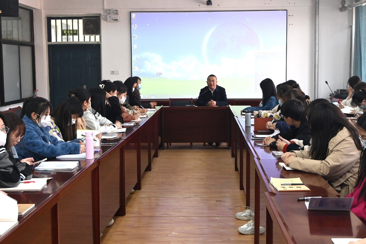 办学根本是以培育基础教育师资为主,认真钻研语文教育与文学发展。“一代人有一代人的使命,一代人有一代人的担当”,他对同学们提出了两点要求:一是要时刻牢记艰苦历程,保持奋斗青春底色,端正思想意识,争做有理想有担当的时代新人;二是要充分认识自己的责任和使命,加强学习和科学素养,面对现实不卑不亢,关注时代发展、融入社会实践,时刻审查自身状态,合理规划学习进度与职业安排,不失奋斗勇气。