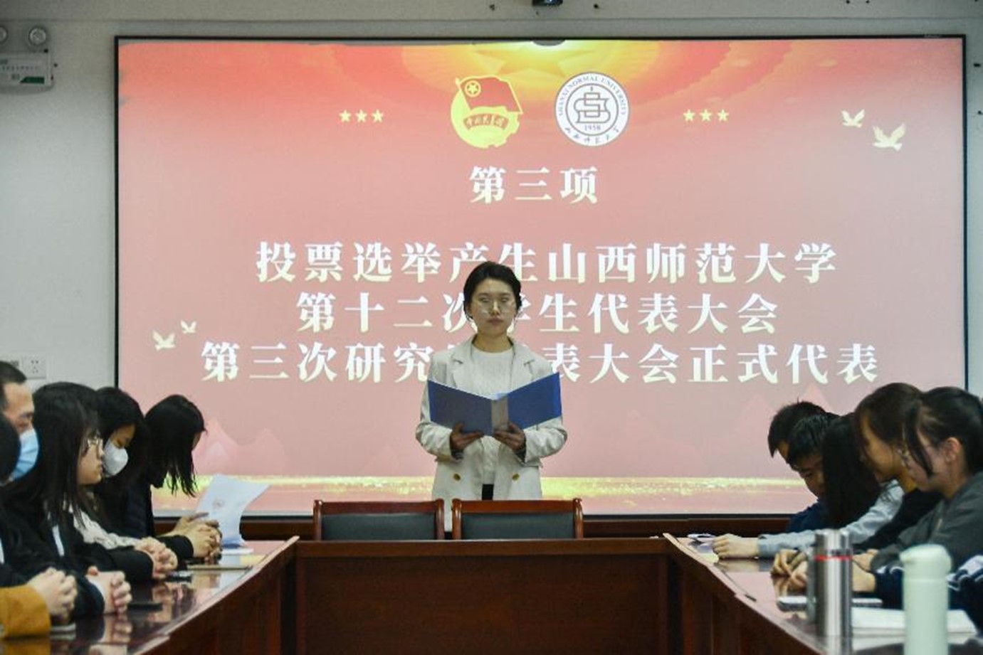 学生代表大会、研究生代表大会秉持公平公正公开的原则开展选举工作。毛临辉宣读《大会选举办法》、介绍研究生和本科生学生代表候选人名单,并通过举手表决确定了大会候选人、监票人和计票人名单。随后各参会代表进行民主投票,最终,大会选举安李蓉当选山西师范大学第三次研究生代表大会候选委员,江帆、崔金金当选山西师范大学第十二次学生代表大会候选委员。