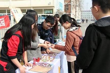青年志愿者服务队共同发起的旨在“弘扬雷锋精神,传承民间艺术”的剪纸义卖活动现场。