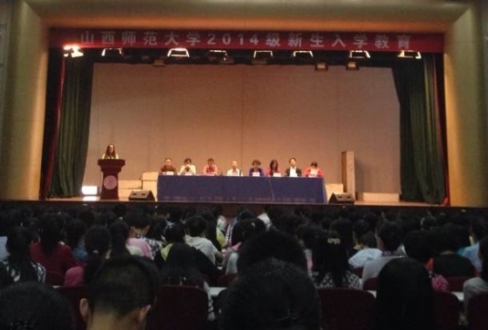 在文化艺术活动中心顺利举办2014级新生入学教育动员大会。出席本次会议的院领导有:院党委书记吴华英,院长延保全,党委副书记强汾生,副院长赵变亲,副院长栗永清,新闻传播系主任张才明,中文系主任李伟,团委书记孙学虎,以及2014级各班辅导员李奎老师,李晰老师,郭辉老师,薛月兵老师。2014级361名新生精神饱满地参加了会议。院团委、学生会主要干部列席会议。