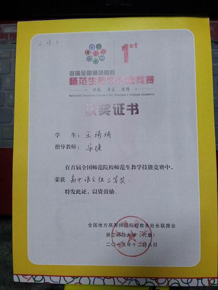 12月7日、8日,竞赛在浙江师范大学进行。比赛分教学设计和课件制作、即席演讲、模拟授课三个环节。王琦琦同学以流畅、清晰的演讲和对《奥斯维辛没有什么新闻》的准确理解、精彩讲解,在来自全国62所师范院校的语文组选手中取得三等奖第三名。