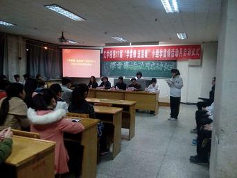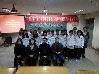 第17届“学雷锋送温暖”小组(第二季)学雷锋活动月暨2014年青年志愿服务系列活动启动仪式在12106教室顺利举行。院党委书记吴华英,党委副书记、学工组组长强汾生,院党委委员、团委书记孙学虎,学工组长助理、专职辅导员李蓉,以及院团委学生会主要干部、各班团支部书记参加了此次活动。