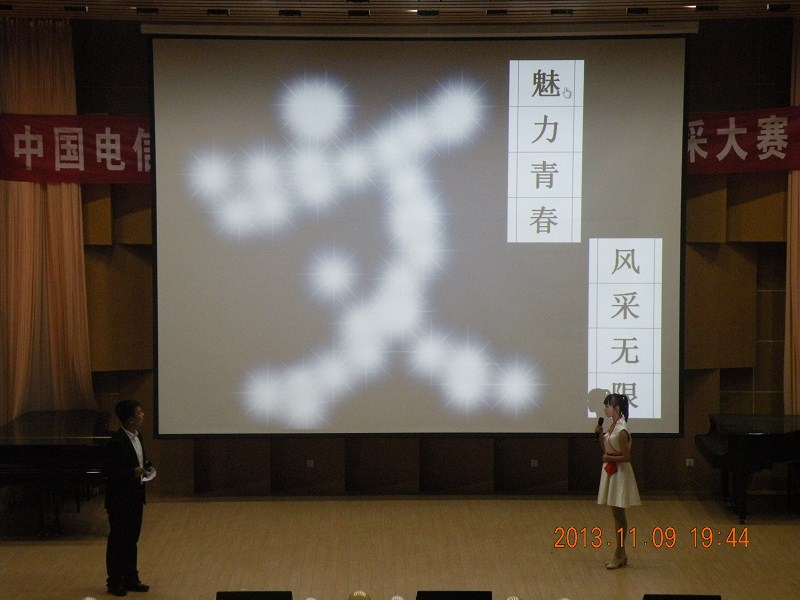 晚7点,师大音乐厅灯火辉煌,主持人宣布礼仪风采大赛正式开始。比赛共分为自我介绍、知书答礼、服装T台秀、个人才艺展示4个环节。礼仪部全体成员进行开场舞表演后,八位参赛选手以幻灯片为辅助分别作了自我介绍,并进入“知书答礼”环节,依次进行自主选题做答,此环节旨在考察她们对于基本文明礼仪知识的掌握程度。在个人才艺展示环节,八位选手分别进行了她们的才艺表演。她们的节目,形式多样,表演精彩,获得观众的阵阵欢呼与喝彩。“服装T台秀”是此次大赛的一大亮点,选手们身着各种风格的礼服,伴随音乐在台上尽情展现自己的风采,她们的精彩表现再次引发了热烈的掌声。大赛还特别设置了现场抽取幸运观众环节,每个抽奖环节都有三位幸运观众获得师大电信提供的礼品,有效的增强了与观众的互动,活跃了现场气氛。此外,比赛过程中还穿插了外联部的精彩小品《新闻联播之外联特写》,以及电信营业厅选送的学生个人演唱《两地曲》、迈克尔杰克逊的激情舞蹈等节目。
