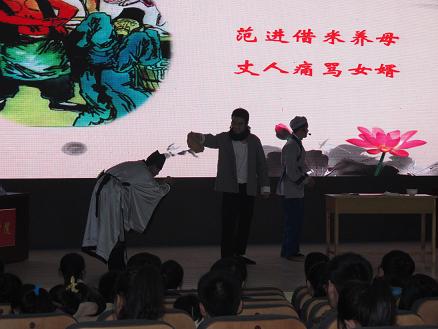 比赛分半决赛和决赛两场,在16日上午的半决赛中,我校代表队选手发挥稳定,以小组第二的成绩晋级决赛,在17日下午进行的决赛中,评委组在此前考核的基础上增加了“即兴说理”环节,重点考察参赛选手随机应变、知识点灵活运用的能力,并在“诗词创作”环节重点考察选手们对于古诗平仄押韵,对偶用典方面的作诗知识。我校选手在知识竞答环节沉着应战、冷静分析;在即兴说理环节逻辑严谨,丝丝入扣;在人文演绎环节《范进中举》中高潮突出,人物鲜明,赢得了现场评委、观众的一致好评。