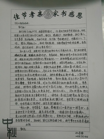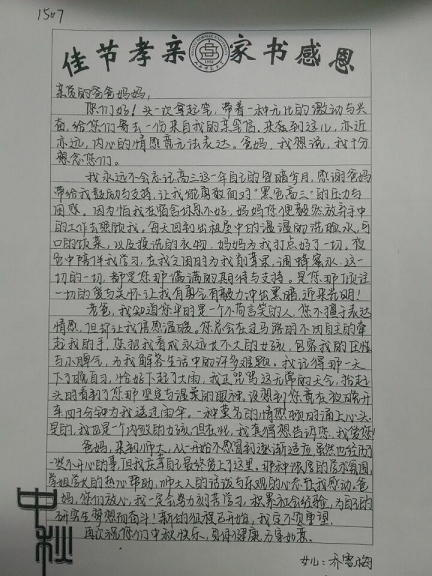 学工组的策划下,院学生会特在大一新生中举办了“佳节孝亲,家书感恩”主题教育活动。本次活动由生活部与心理健康部共同组织实施。