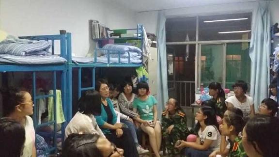 1503、1504班辅导员鲁立智老师向同学们讲述自己年轻时的军训经历,关切询问各宿舍新生的身体状况,提醒他们要按时作息。鲁老师还告诉大家应当正确处理学习与学生会和社团工作的关系,可积极参与但应当做好协调。