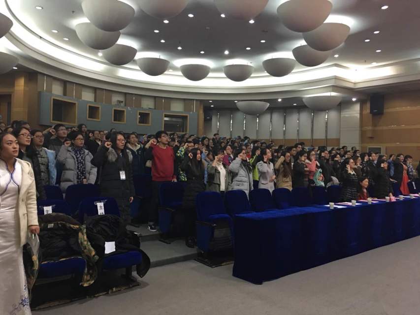 团委为观众们播放了视频《入学初体验》,短短十分钟的视频,不仅记录了大一同学初入大学校园时的记忆,也向大家展示了他们入学以来的收获及对未来的美好憧憬。视频结束后,为了让同学们牢记自己共青团员的身份、铭记自己的责任,团委特组织现场的同学们重温入团誓词,面向团旗进行了宣誓。