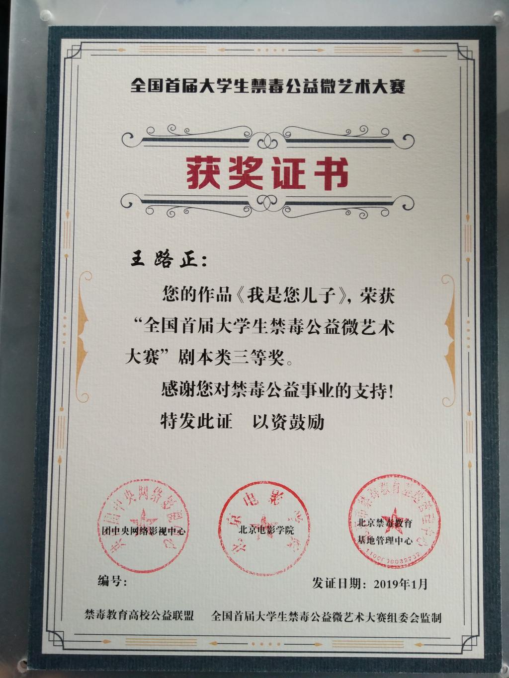 “学雷锋,送温暖”小组学生党支部成员王路正(莳英生)的剧本《我是您儿子》获三等奖。颁奖典礼结束后,来自全国近20所高校的30余位获奖代表参加了大学生禁毒作品创作研讨会。