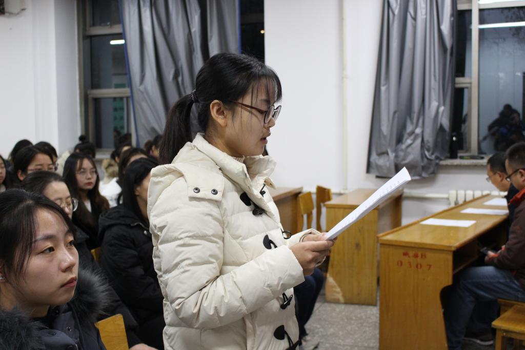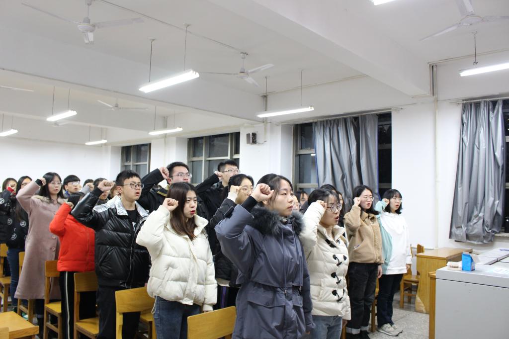 在12206教室举行新党员入党宣誓大会。院党委副书记钱成、院团委副书记樊琳琳、编辑出版学及汉语国际教育学生党支部书记何伟出席, 43位新发展党员、45位正式党员参加宣誓,樊琳琳主持本次大会。