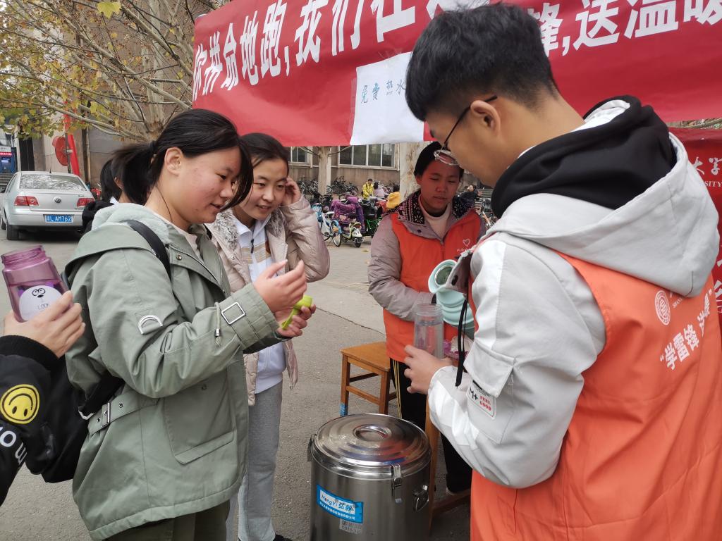 11月26日至30日,“学雷锋,送温暖”小组在操场西侧搭起帐篷,组织了一支长跑后援队,为长跑结束后的同学们提供热水和休息场所,并取得了良好的效果与反响。