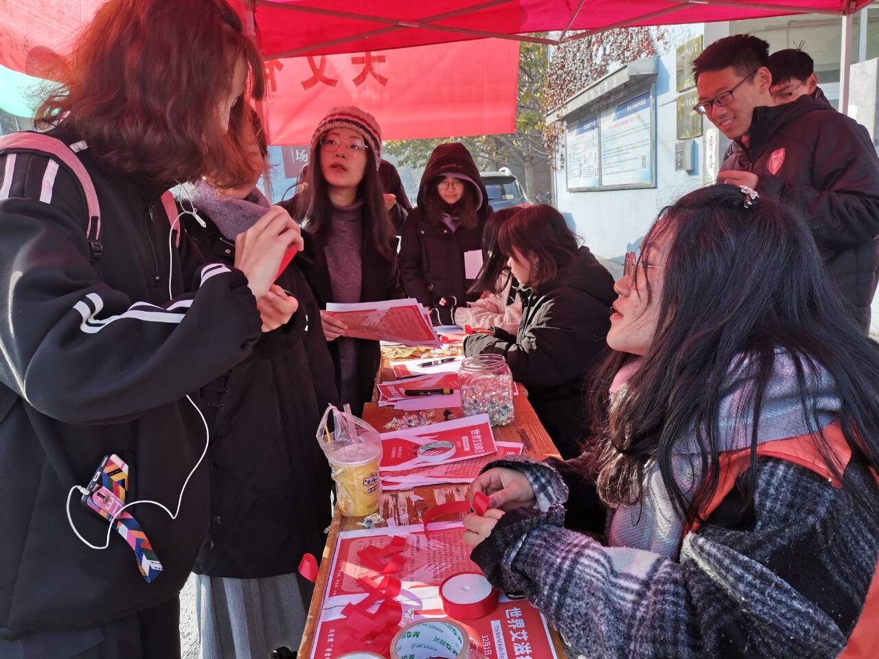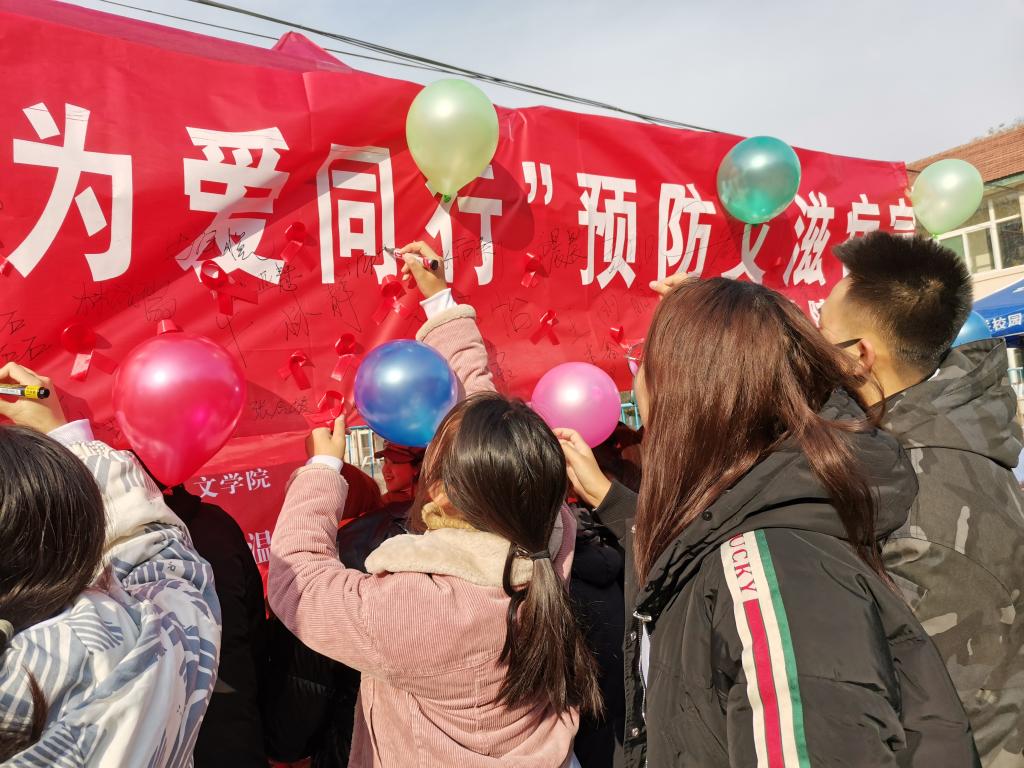 在校医院门口开展了“关艾有你,为爱同行”的主题防艾宣传。本次活动由“学雷锋,送温暖”小组与团委学生会心理健康部承办。近300名同学参加了本次活动。