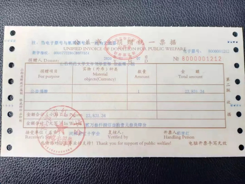 十元、二十元、五十元、一百元……募捐通知一经发出便受到了同学们的积极响应,截至2月4日,在820余名同学的踊跃参加下活动首批筹集的捐款数额达23831.34元,小组将文院学子的点滴爱心汇聚成河,并第一时间捐助给我校战略合作城市运城市河津市红十字会,为这场全民战“疫”献微小爱心、尽微薄之力。