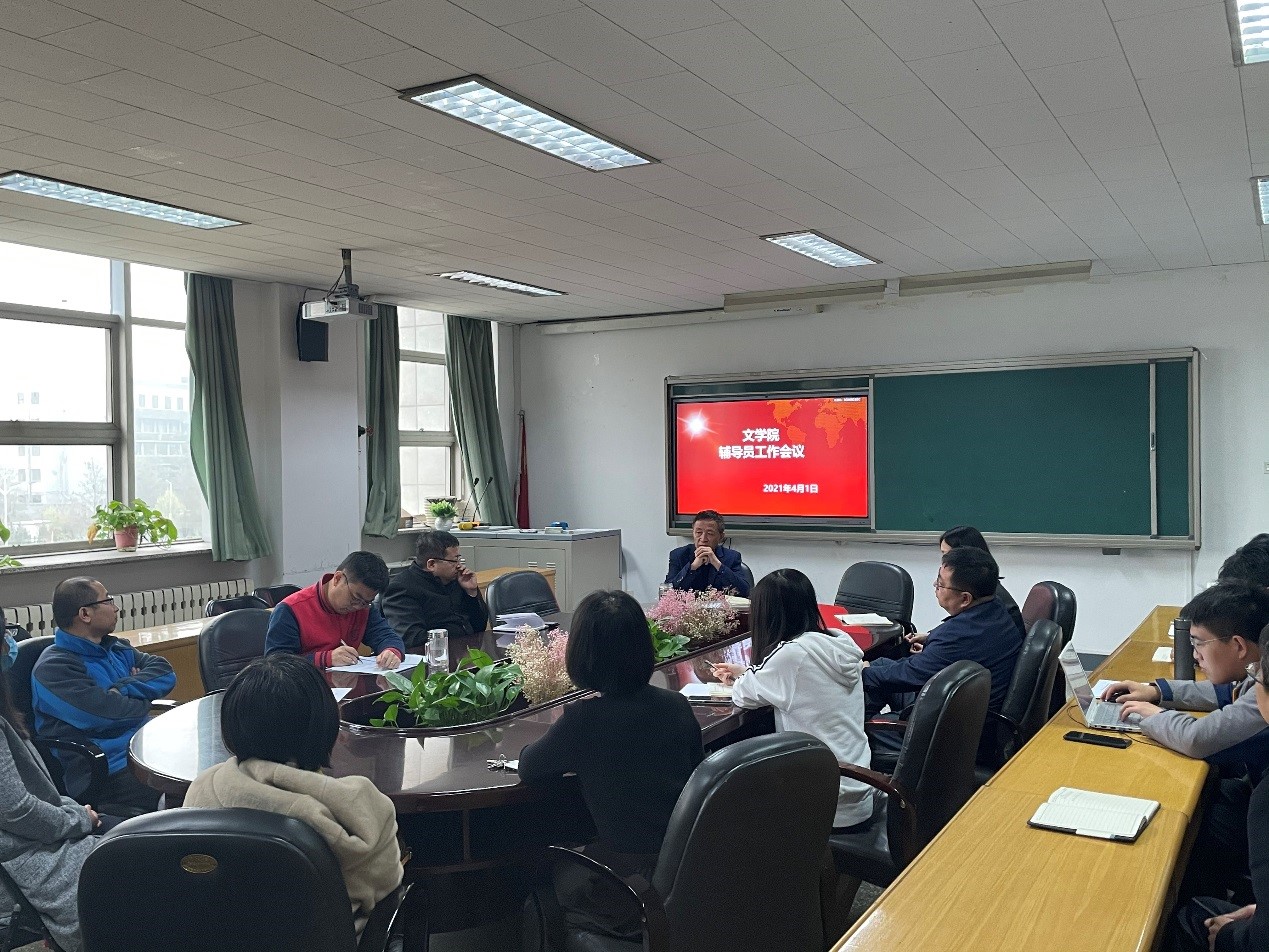 会议室召开辅导员工作会议,全体辅导员参加,会议由党委书记强汾生主持。