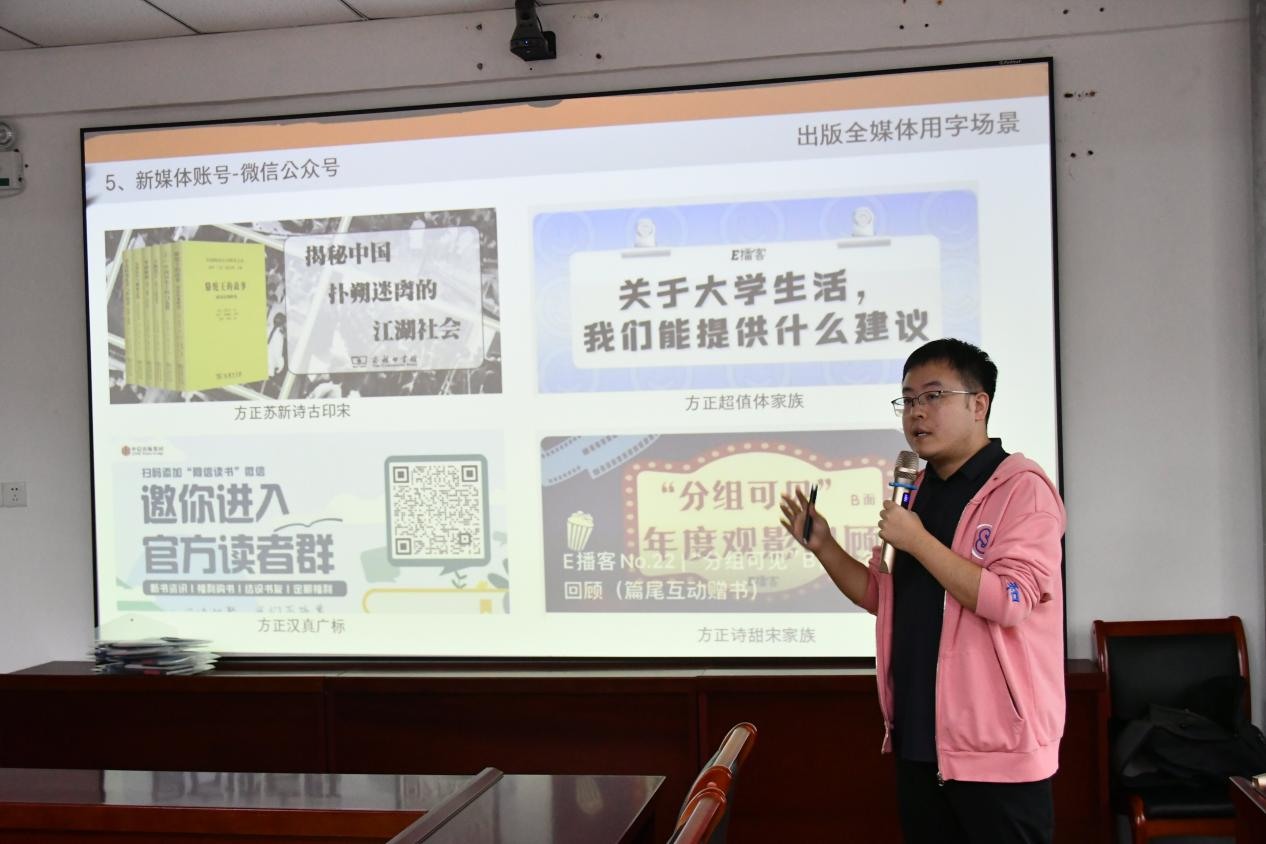 副院长、郝建国副教授《马克思主义出版观视阙下党报话语体系的发展和创新——基于<人民日报>的分析》;新京报创刊成员、高级网络营销师张浩淼、北大方正电子产品部总监周循、方正电子院校业务总监陈富豪也作了《出版物新媒体运营经验分享》《出版新媒体用字分享(字由字在系列)》;《交互式出版物策划与制作》等讲座。