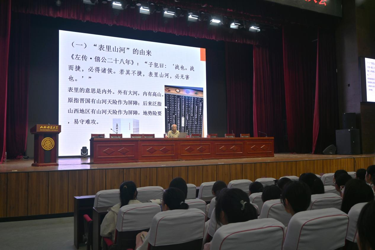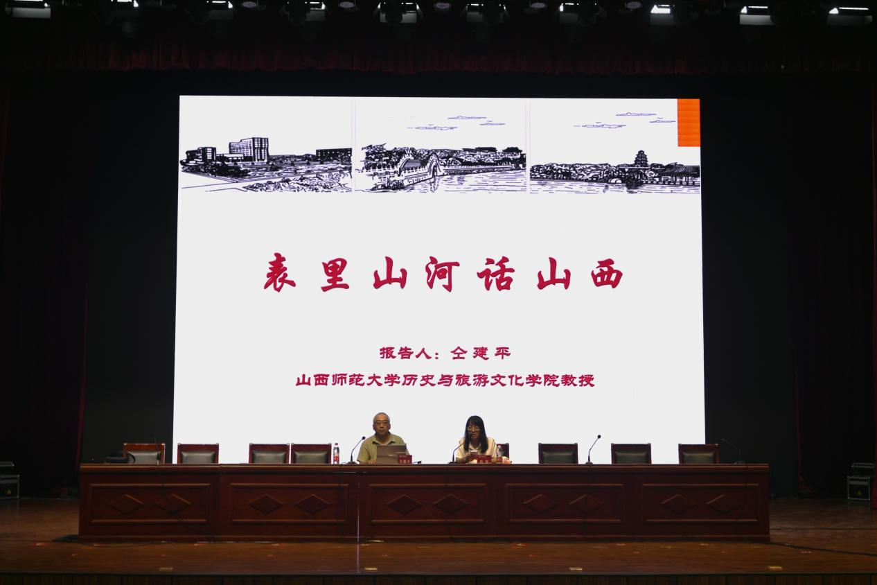 仝建平依托山西的地理形势、文化区域和先进文化元素三个方面展开以“表里山河话山西”为主题的讲授。他首先介绍了山西地理形势并提出,山西外有大河、内有高山,山西有山河天险作为屏障,地势险要,易守难攻,在历史上曾发生过“退避三舍”“一战成霸”“践土会盟”等一系列故事。又从山西地形出发,介绍了山西的“五岳”“六水”“五盆地”以及塑造山西四边的太行山、黄河、长城特色以及对外交流路径。仝建平还对山西五大文化区域进行了介绍,各区域文化特色鲜明,形象独特。在分析山西历史的先进文化因素中,他谈到,山西是中华民族重要的发祥地之一、华夏文明的直根;是中华民族融合的大舞台,是中华民族寻根祭祖的圣地;是红色文化的家园,也是中华民族的艺术博物馆。