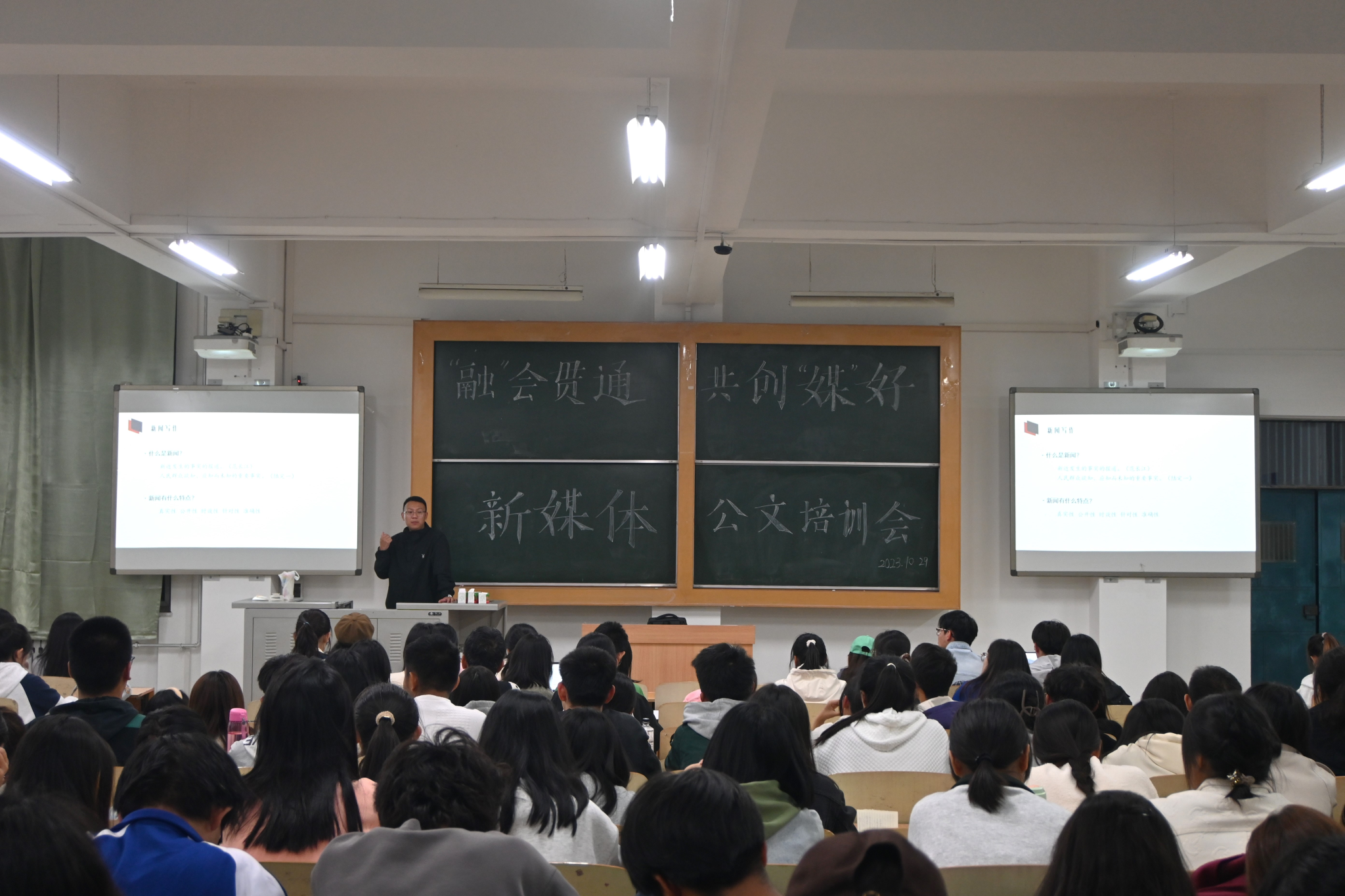 讲座中,郭豪杰从“新闻是什么”“校园新闻怎么写”“常用应用文写作”“如何让应用文更具美感”四个方面进行了详尽阐述。他指出,新闻写作一定要严谨、准确,注重时效性,要注意到细小琐碎之处,严肃的同时兼具美感。高沛然依据相机基本原理,对于图片拍摄、视频剪辑进行了讲解。他强调,新闻摄影拥有全景、中景、特写三大景别,摄影者需要从摄影内容中传达出关键信息。讲座后,同学们积极讨论,营造出求学求知的良好氛围。