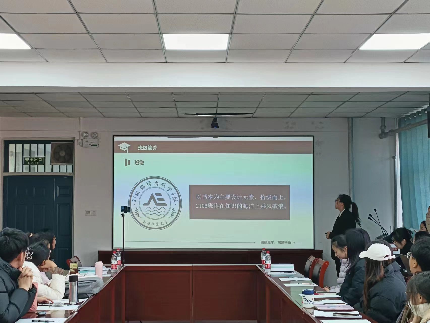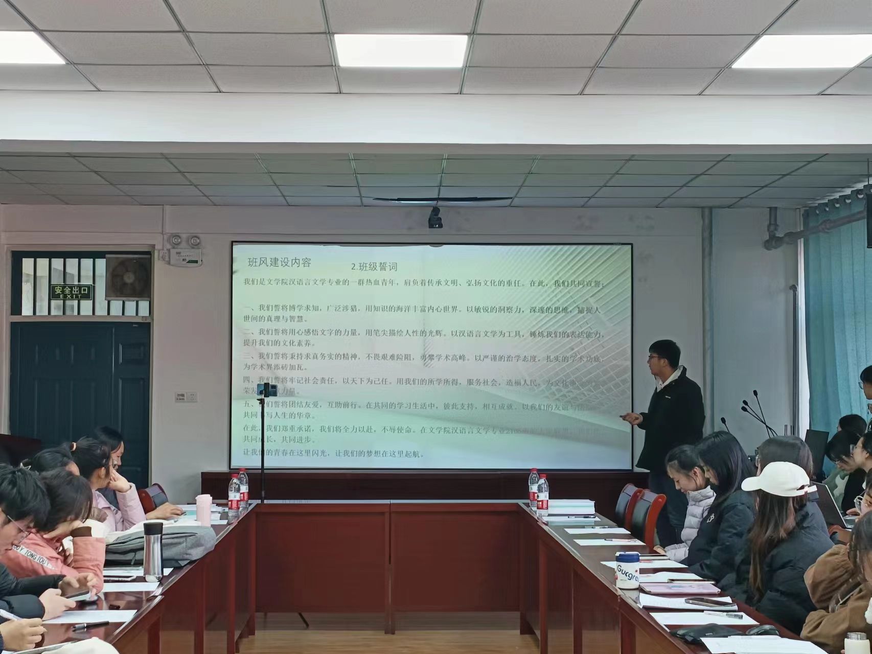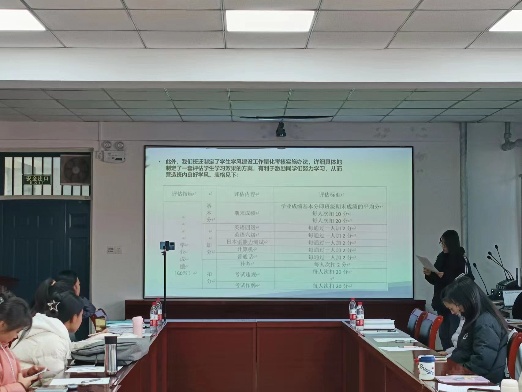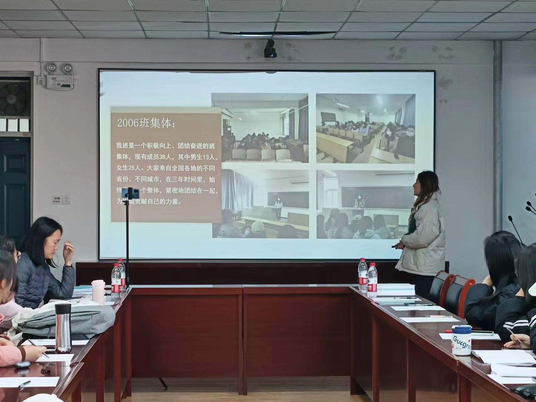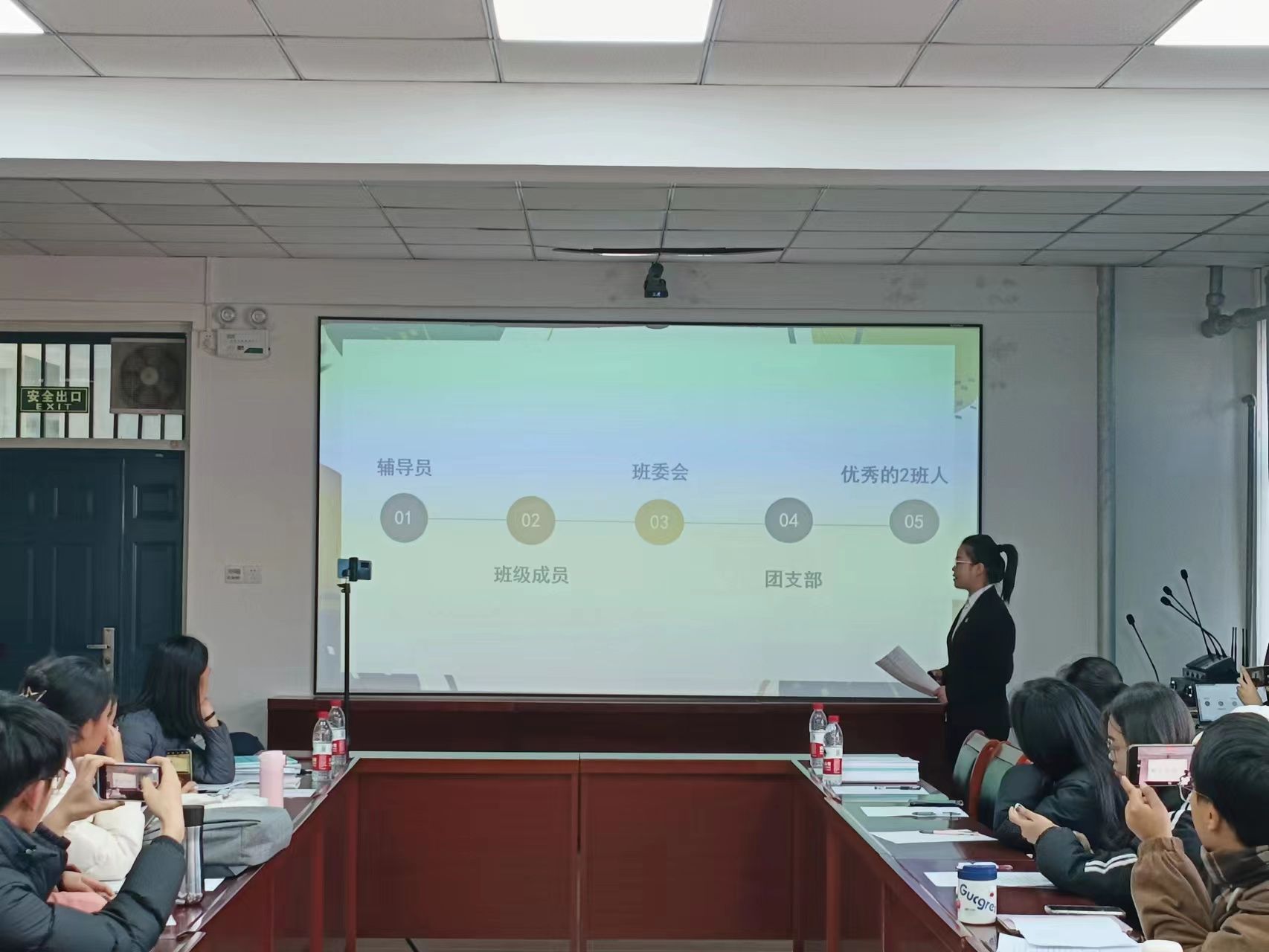 于2201会议室举办先进班集体答辩。副院长樊琳琳、全体辅导员、学生代表担任评委。
