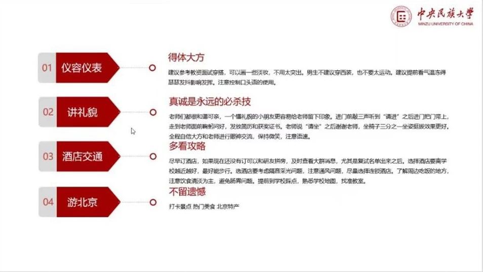 姜晋楠向同学们做了关于中央民族大学的考情介绍,分享了相关学科语文专业的复试流程,并详细介绍了同学们在面试时的应做的各项准备工作,包括穿着、礼仪、态度等方面,尤其强调面试时要保持良好的心态。她提到,复试期间要针对学校做好充分的攻略,密切关注官方消息。最后,姜晋楠鼓励同学们只要坚持下去,就会迎来未来的美好曙光。