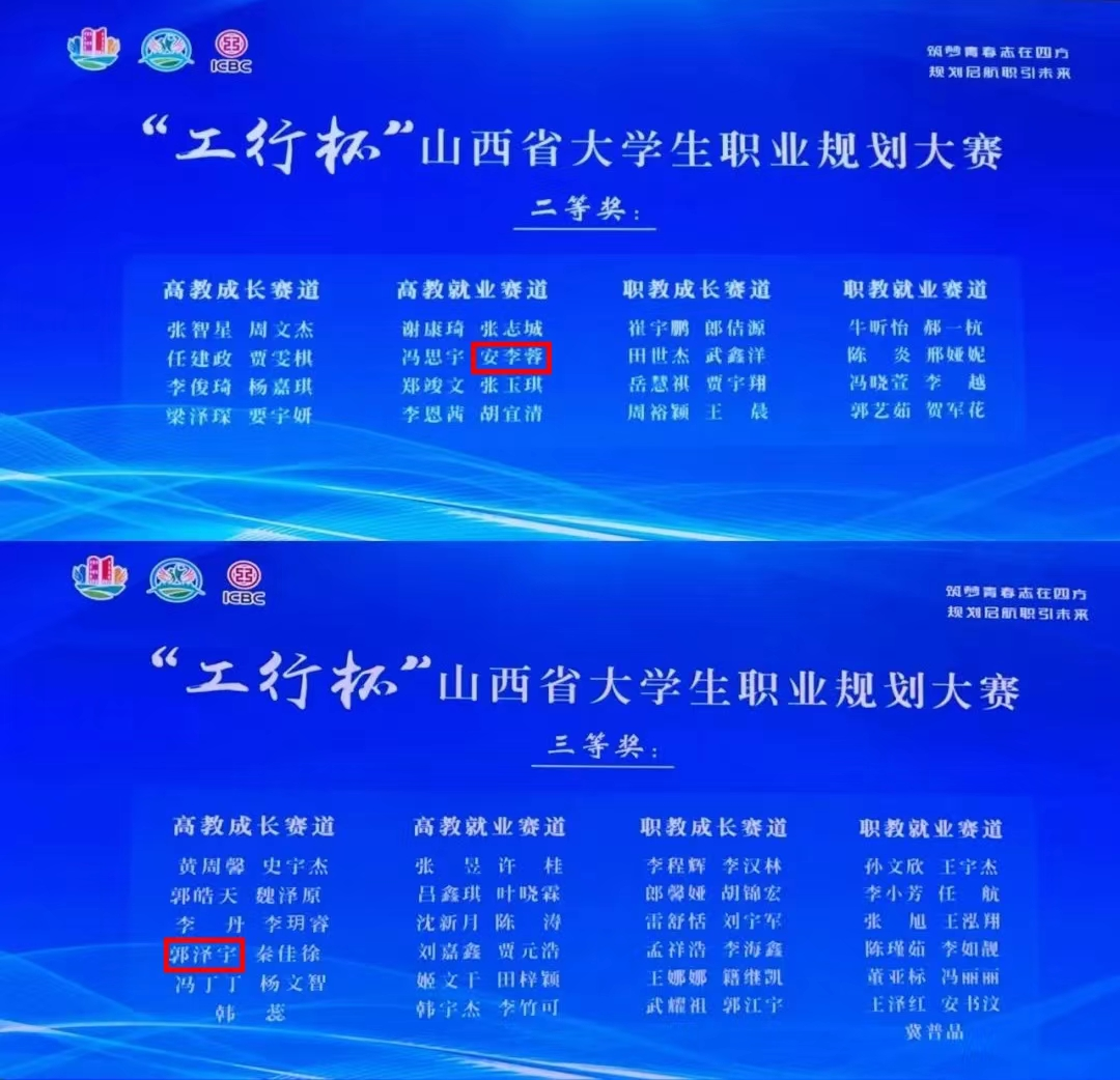 安李蓉获得高教就业赛道二等奖,郭泽宇获得高教成长赛道三等奖。