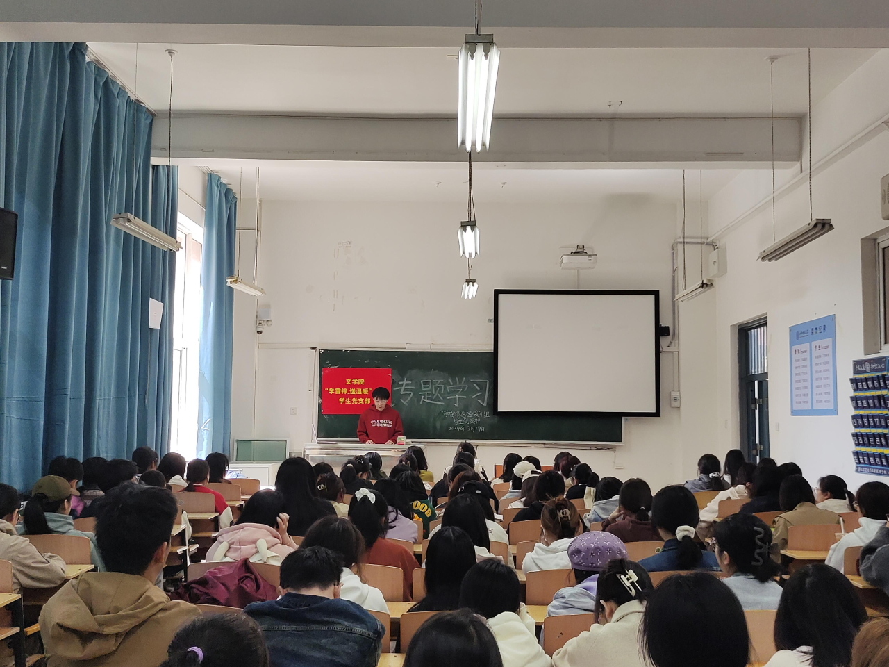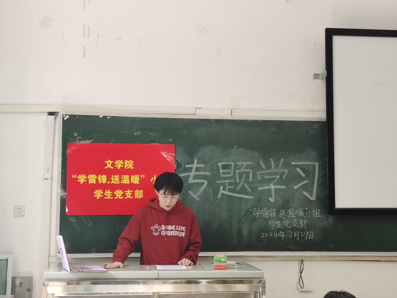 “学雷锋,送温暖”小组学生党支部在南区3101教室组织开展四月党史学习专题活动,会议由支部书记安李蓉主持,支部全体党员和积极分子参加。王睿轩担任主讲人。