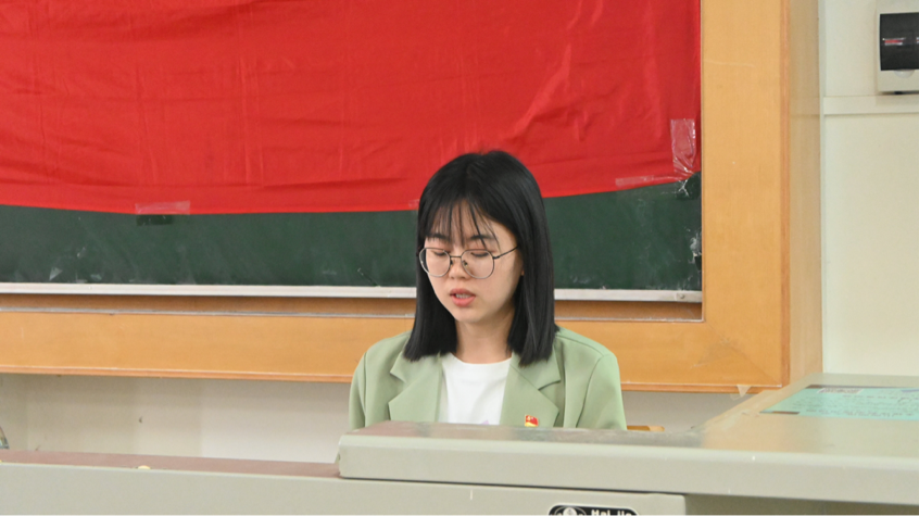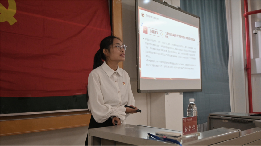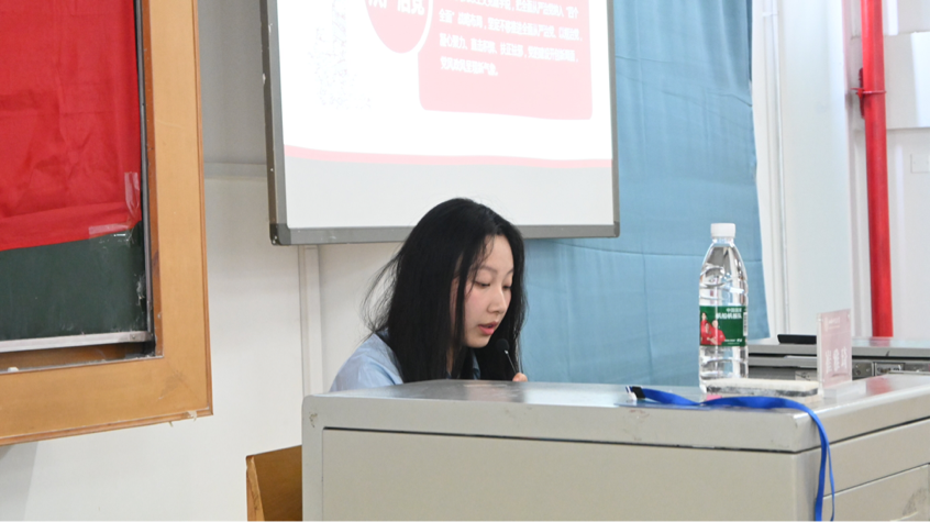 “四力先锋”学生党支部书记陶旨琴从理论维度、现实维度和具体实现方式角度一一展开,详细讲述了新时代中国共产党的历史使命。她指出,积极分子要始终明确人生目标,将个人、集体、社会、国家紧密相连,切实担负好时代所赋予的历史使命。