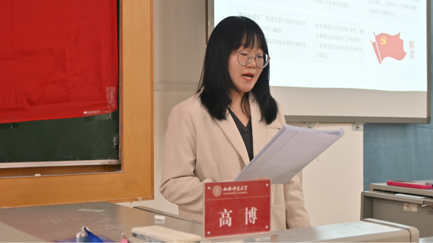 “晋俗晋美”学生党支部书记高博对中国共产党的性质、根本宗旨和最高理想进行了细致的讲解。她强调,党的各项工作始终紧紧地围绕人民,始终心系人民、行动为民,始终坚持最广大人民的根本利益,中国共产党是中国特色社会主义事业的领导核心。