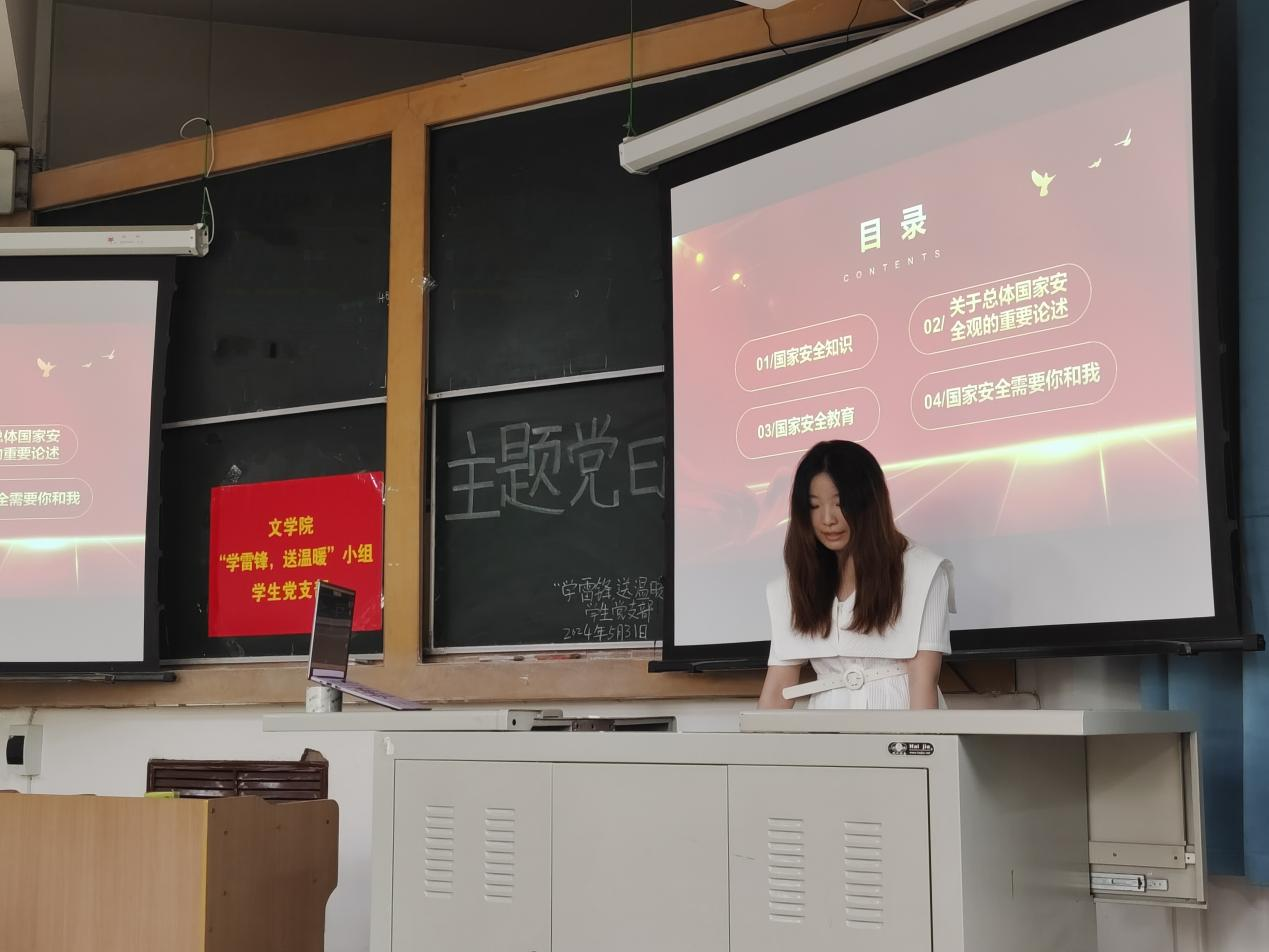 “学雷锋,送温暖”小组学生党支部在南区3106教室组织开展“国家安全,青春挺膺”主题党日活动,会议由支部书记安李蓉主持,支部全体党员和积极分子参加。岳宛蓉担任主讲人。