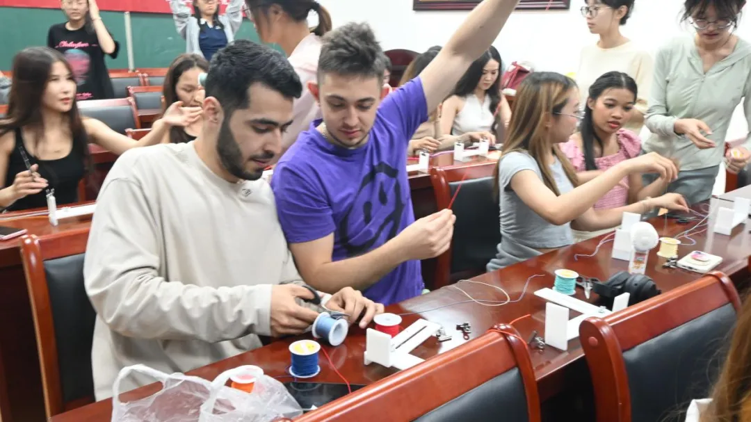 活动开始,夏若晨向留学生们详细讲解了端午节的起源、传说以及相关的风俗习惯,让他们对端午节有了更深入的了解。随后,吕树明和王国明吟诵端午主题诗歌,深邃的思想和优美的辞藻,深深触动着每一位在场者的心灵。肖雅和孟豪杰进行诗词朗诵,带领留学生深刻感受中华文化的博大精深。在编彩绳和制作香囊的环节,留学生们兴趣盎然。伴随志愿者的指导和协助,他们制作出玲珑夺目、立体饱满的香囊,编织出一条条寓意吉祥、美观大方的彩绳,为节日氛围增添了浓厚的色彩。最后,大家一起品尝端午传统美食粽子,一边吃一边听老师介绍粽子的制作方法、粽子的种类及南北方粽子的差异。